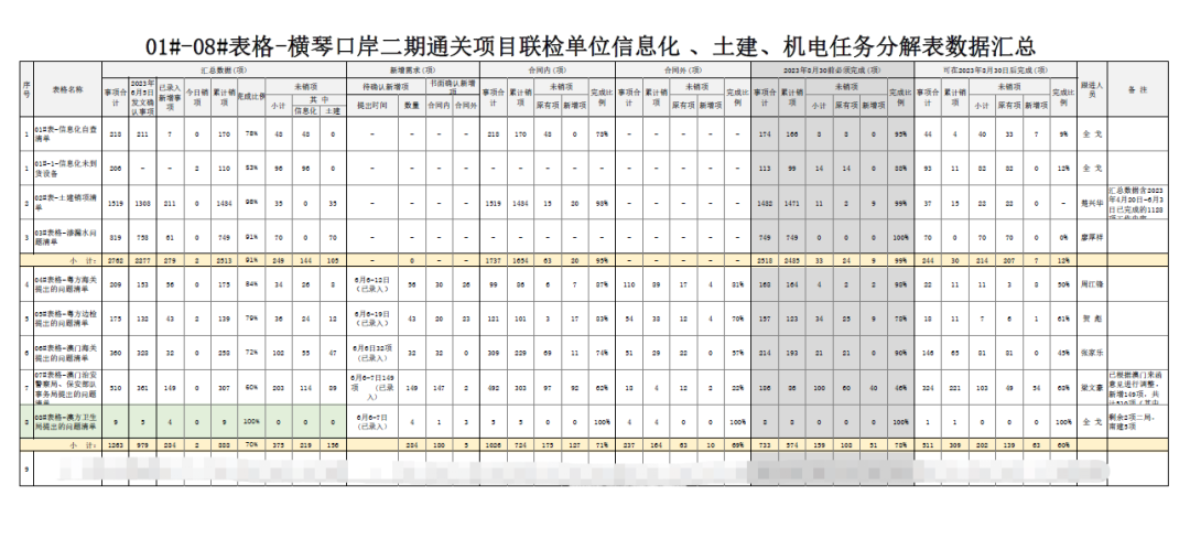 八是清單銷項(xiàng)??诎吨笓]部延續(xù)“5+2”、“白+黑”的工作模式,解決現(xiàn)場(chǎng)推進(jìn)過(guò)程中遇到的實(shí)際問(wèn)題,確保問(wèn)題不過(guò)夜。沖刺階段,更是堅(jiān)持每天下午17:00組織參建單位召開(kāi)工作協(xié)調(diào)推進(jìn)會(huì),重點(diǎn)梳理土建工程、信息化工程剩余工作推進(jìn)情況、材料設(shè)備到場(chǎng)情況、質(zhì)量問(wèn)題整改情況等,形成8份銷項(xiàng)表,包括粵方海關(guān)、粵方邊檢、澳方海關(guān)、澳方邊檢、澳方衛(wèi)生局等需協(xié)調(diào)解決的問(wèn)題,實(shí)行“問(wèn)題清單銷項(xiàng)督辦”的機(jī)制,要求各責(zé)任人“鎖定需求、對(duì)表作戰(zhàn),對(duì)照銷項(xiàng)”。據(jù)統(tǒng)計(jì),梳理大小問(wèn)題多達(dá)3000余項(xiàng)。