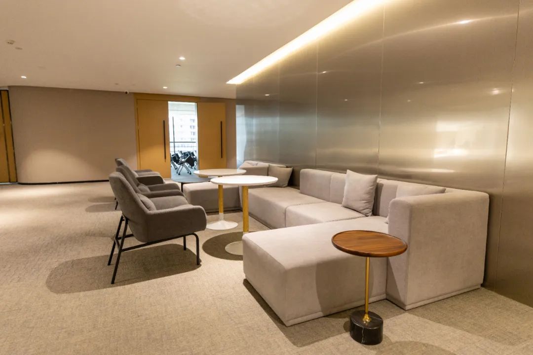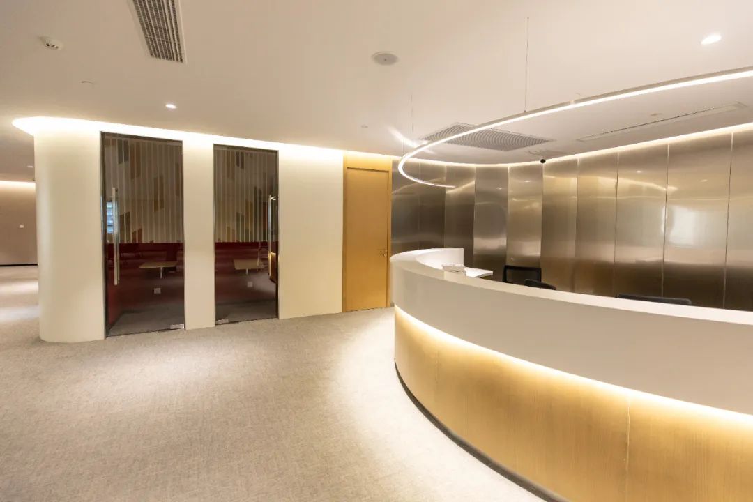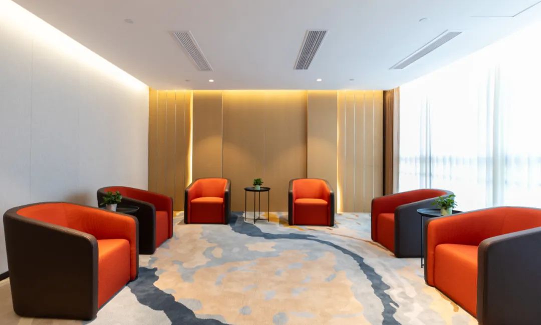 沒有鮮艷的色調(diào),摒棄傳統(tǒng)辦公空間所青睞的金碧輝煌風,改用棕色座椅搭配著灰白色地毯,咖色沙發(fā)搭配棕紅色背景墻,慢慢過渡的色彩讓整個空間更加柔和、干凈和高雅,無論是辦公還是社交,都能給人提供一個有溫度的空間,讓科創(chuàng)er的工作和生活連結(jié)地更加融洽。