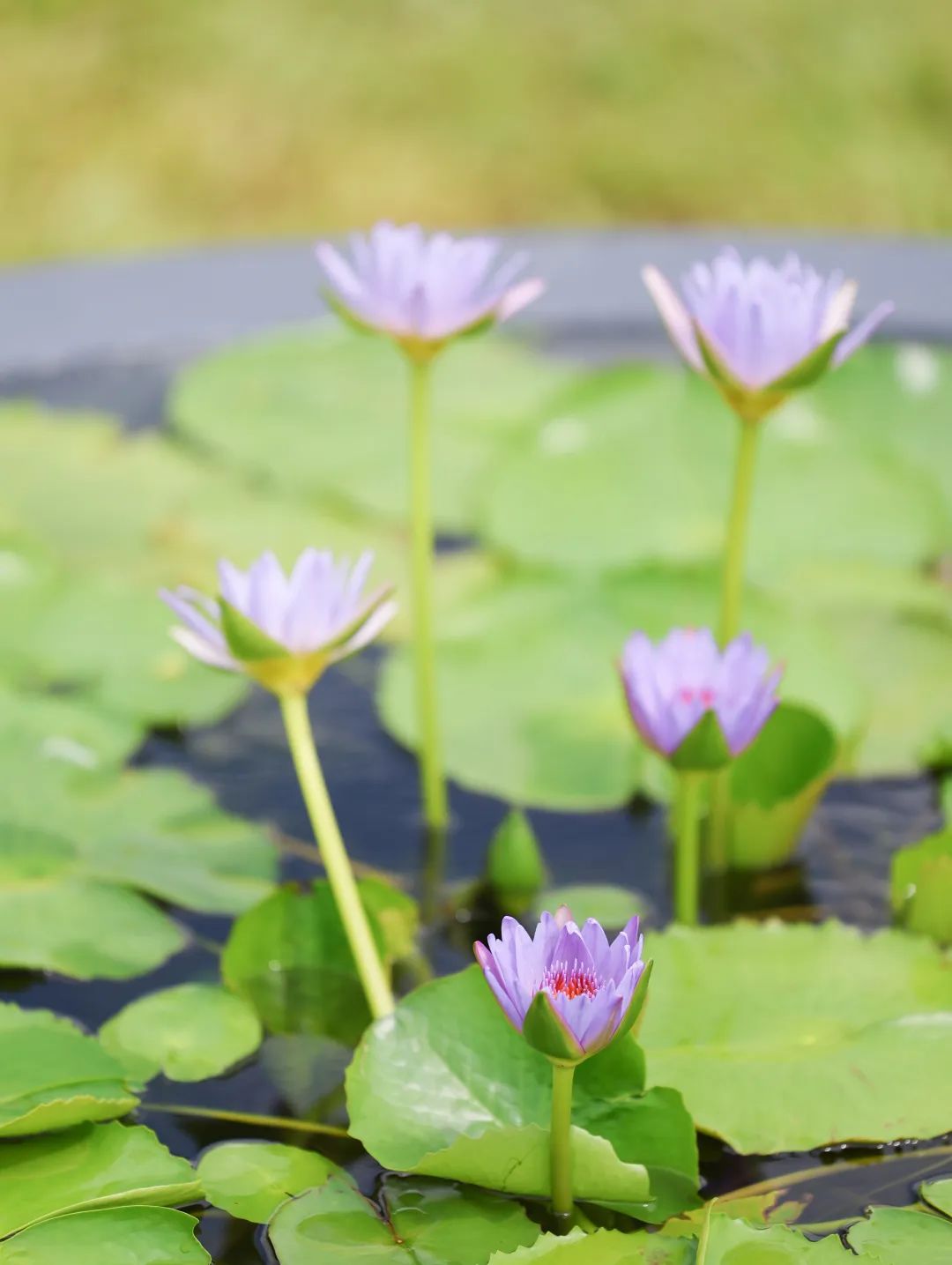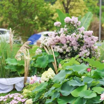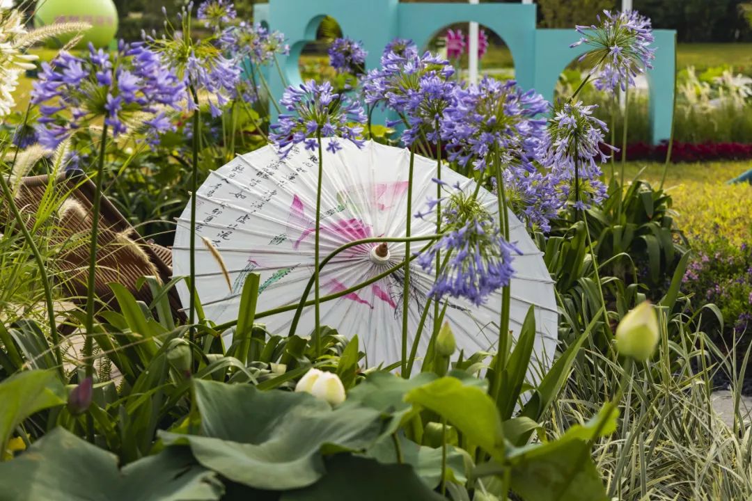展園整體以典雅氛圍為基調(diào),白荷花與藍(lán)紫色的百子蓮則為點(diǎn)睛之筆,形成視覺焦點(diǎn),現(xiàn)代素材與傳統(tǒng)意境相互碰撞,打造清新與浪漫的場景。