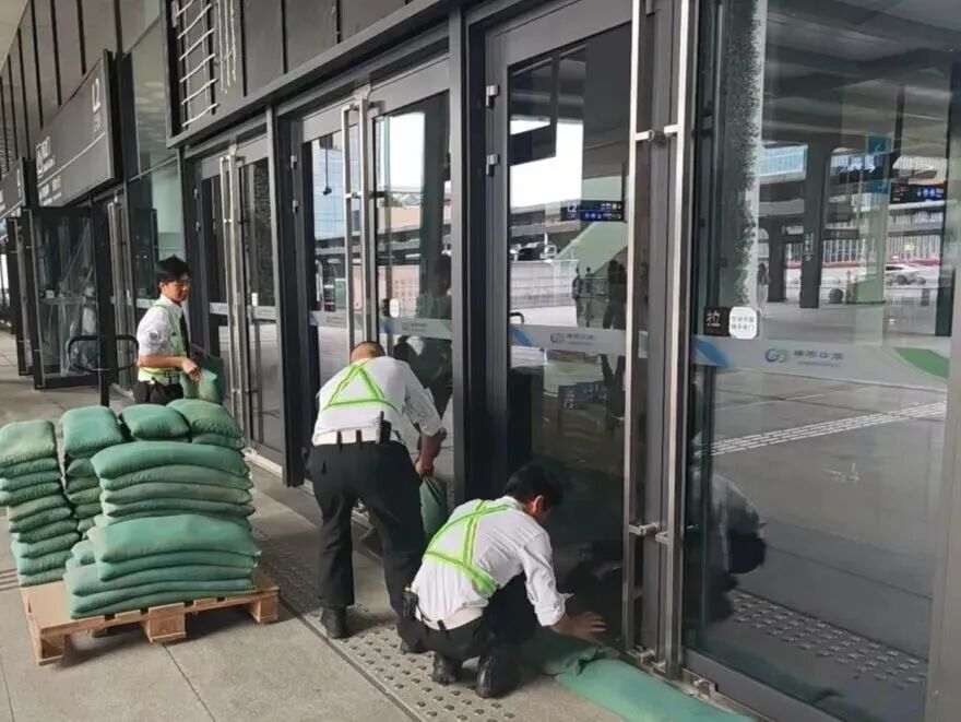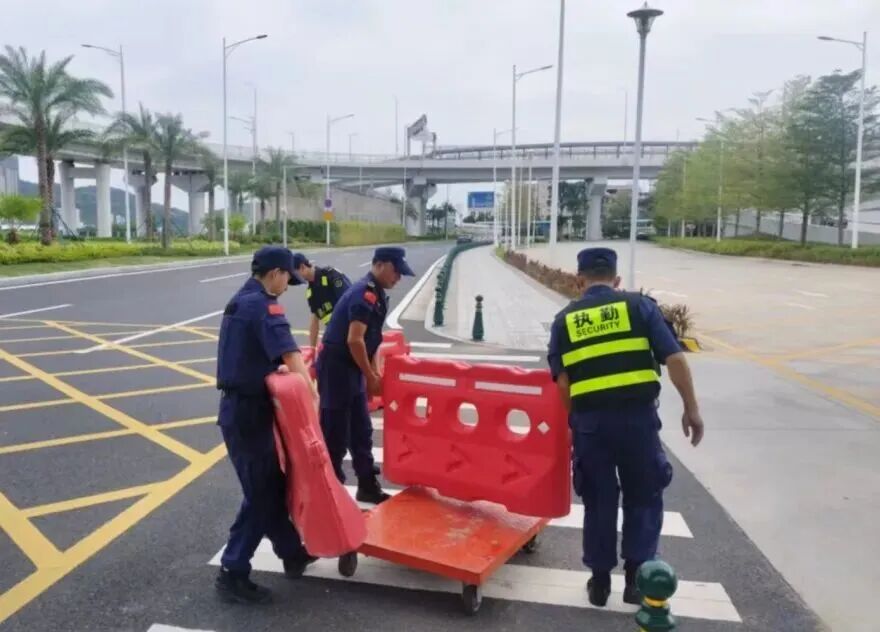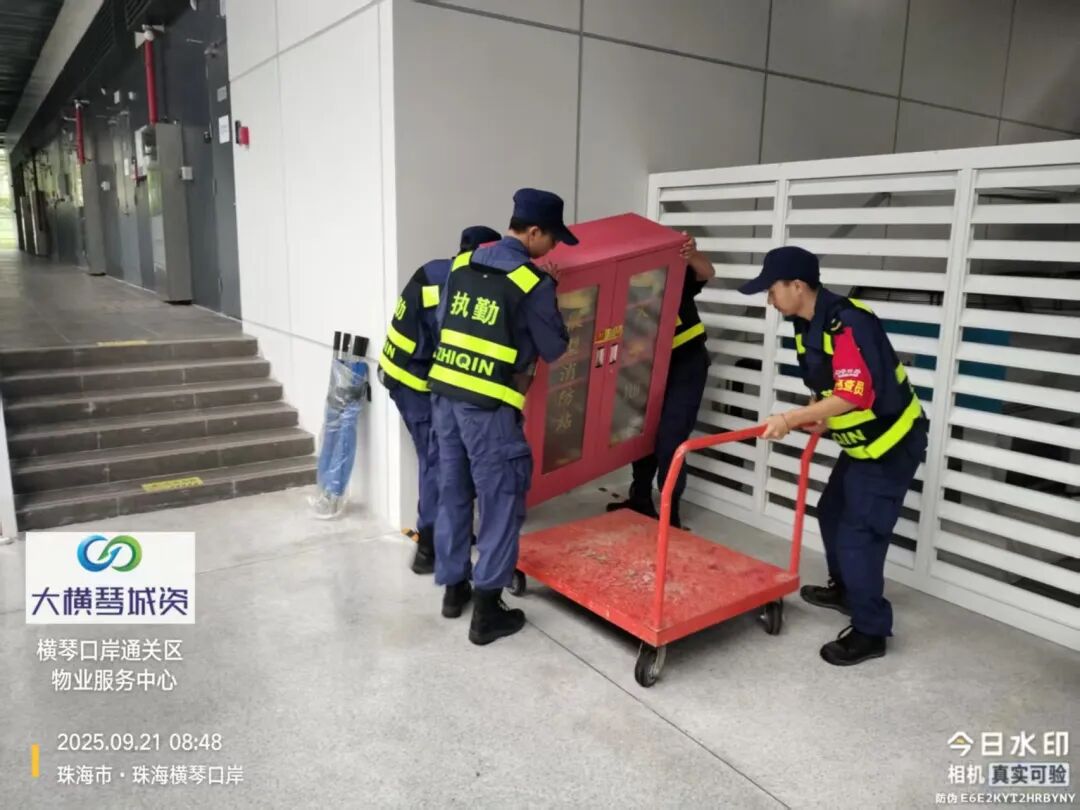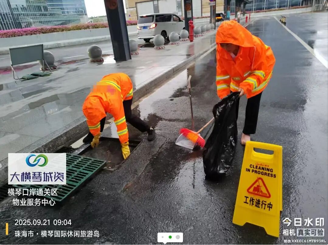 在橫琴口岸區(qū)域,提前排查200多個集水井,調(diào)集230個緊固件加固門窗,近3000條沙袋、近100個防洪擋板、11臺水泵等應對福臨道、地庫36處接駁口、負二層下沉庭院、U行車道等重點區(qū)域強排和封堵需要。同時對通關區(qū)域的100余扇玻璃門進行加固,在易水浸區(qū)域放置沙袋、擋板。同時,全面清理雨水井、排水溝渠,確保排水暢通。